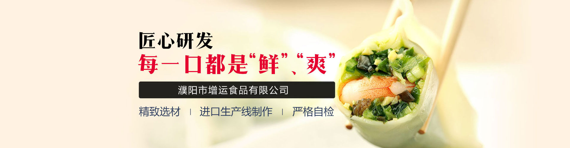 河南·濮陽(yáng)增運(yùn)食品有限公司位于龍的故鄉(xiāng)--濮陽(yáng),是一家生產(chǎn)速凍米面食品的專業(yè)公司,著力打造“增運(yùn)”品牌,產(chǎn)品主要有速凍水餃、湯圓、餛飩等三大類,主要以水餃、餛飩為主。公司擁有兩個(gè)先進(jìn)加工車間,一個(gè)凍品加工車間,能滿足各種速凍產(chǎn)品的加工需求。